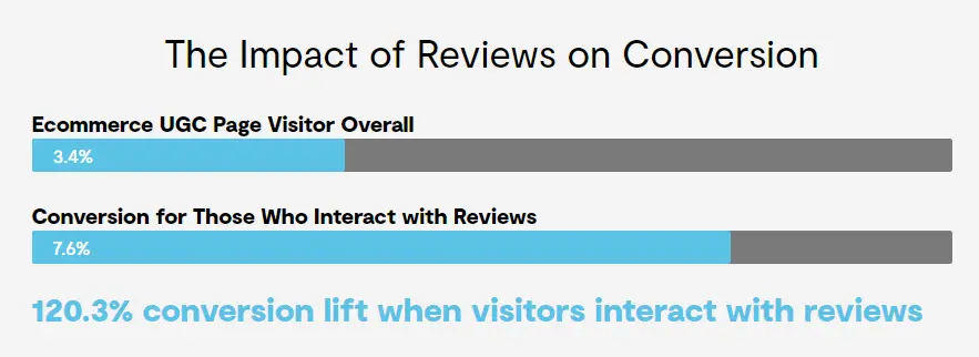 According to the 2021 UGC Conversion Impact Analysis, interacting with ratings and reviews on a product page can boost conversion rates by 120.3%.