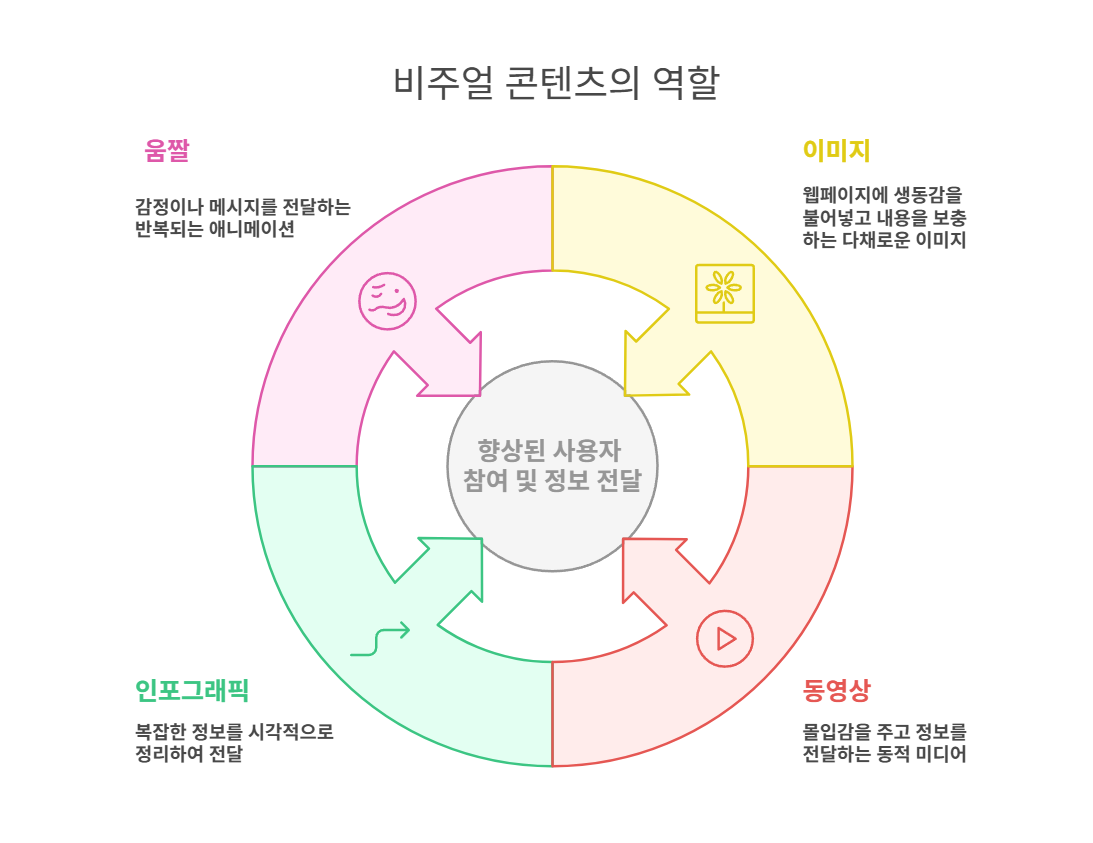 비주얼 콘텐츠는 시각적인 요소를 활용하여 정보를 전달하거나 메시지를 전달하는 모든 형태의 콘텐츠를 포괄하는 용어입니다. 이는 단순히 텍스트를 보완하거나 미적인 가치를 더하는 것을 넘어, 콘텐츠 자체의 핵심적인 역할을 수행합니다 . 텍스트 콘텐츠와 달리 비주얼 콘텐츠는 시각적인 매력을 통해 사용자의 주의를 빠르게 사로잡고, 복잡한 정보도 쉽고 명확하게 전달할 수 있다는 강점을 지닙니다 .